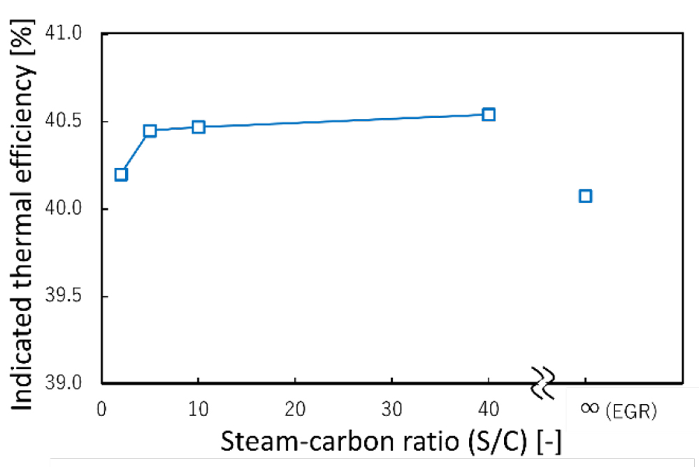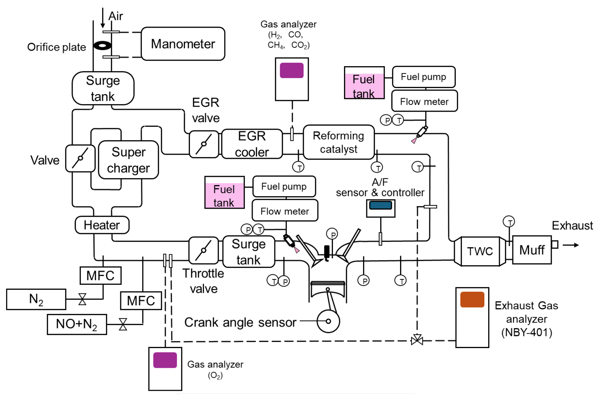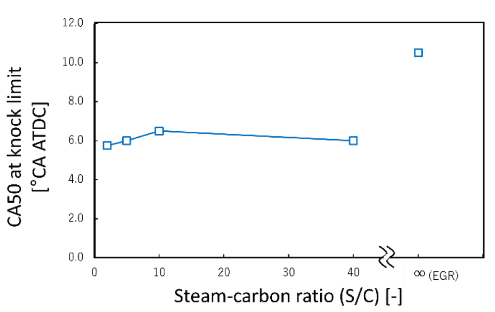 辻ら(1)は排気再循環経路内燃料改質(REGR)の火花ノック抑制効果を明らかにし、その要因の解明を行った。図1に実験装置を示す。EGR経路に改質触媒を設け、燃料インジェクタから改質燃料を供給することで、水素やCOを発生させ還流させている。改質触媒のS/C比(Steam-carbon ratio)を2〜∞の範囲で変化させ測定したノック限界CA50を図2に、ノック限界における図示熱効率を図3に示す。EGR条件(S/C=∞)と比較しREGRでは、ノック限界CA50を最大4.5°CAノック抑制効果が認められ、点火進角可能となり、熱効率で最大0.5ポイント向上している。さらに、REGR条件下では改質燃料添加量がごく少量でも触媒下流NO濃度が大幅減少することが確認された。一方、水素発生量とノック限界には明確な相関が見られていない。加えて、検証のため行ったNO添加実験(図4)では、吸気NO濃度の増加に比例してノック限界CA50が遅角し、NOがノックを顕著に助長することが示された。以上の結果より、REGRによるNO除去がノック抑制の主要因の一つであると報告があった。今後は水素の影響についても、さらなる解明が期待される。