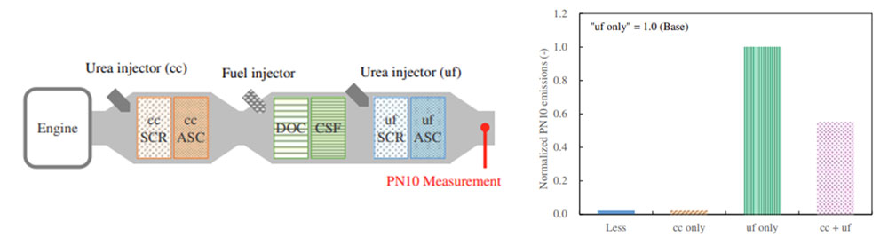 阿野田ら(2)はディーゼル機関のEuro7対応後処理システム((図2左))のPN10排出挙動について詳細に調査した。尿素水を噴射する位置と温度によって尿素水由来のPN10が大きく変化し、近接(close-coupled, cc)SCR上流位置で尿素水を噴射した場合はPN10がほとんど排出せず、床下(under-floor, uf)SCR上流位置で尿素水を噴射した場合にPN10が顕著に増加した。DPF強制再生やDPF連続再生が起こる高負荷時のPM燃焼過程でのPN10排出量を調査したところ、高排ガス流量条件においてPN10排出量が増加した。この具体的なメカニズムは未解明だが、PM燃焼が部分的に進んだ状態(図3の(B))で一時的に局所流速が上昇することでPN10排出ピークを示すという仮説を立てた。この仮説の検証を期待したい。