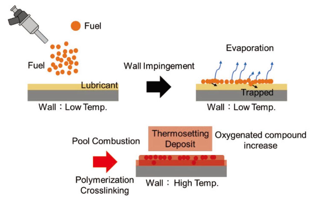 茨城大学の本橋ら(2)は「高効率ガソリン火花点火機関における燃焼室内デポジットのモデル化研究(第1報)」と題した発表で、ガソリンエンジン燃焼室内のデポジット(Combustion Chamber Deposits : CCD)を対象に、その生成メカニズムを明らかにし、そのメカニズムに基づいたCCDの厚みを予測するモデルを構築することを目的とした研究成果を報告している。CCDに関しては、先行研究により、燃焼室内で燃料や潤滑油の部分酸化物が壁面に凝縮・吸着することでデポジットの原料が生成され、その後、壁面温度が上昇することでデポジットの原料の縮合重合反応が促進され、高分子化することでデポジットが生成するという仮説が提唱されている(図4)。