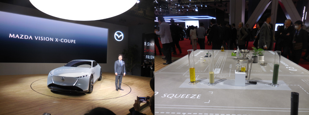 - VISION X-COUPEは2ローターターボ+電動ユニットのプラグインHV。出力508kW、最大航続距離800km。微細藻類から作ったバイオ燃料と走行中のCO2回収装置により(回収装置は別レポートを参照)、走るごとにCO2を減らすをコンセプト。2ローターという響きだけでワクワクする。(吉冨)