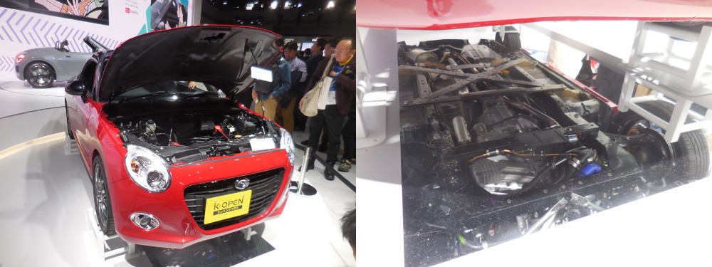 - FRコペンのエンジン位置がかなり低い位置にあるとのこと。ボンネット開けた状態では上からエンジン見えないが、下に用意されたミラーで覗けるようになっている。(吉冨)