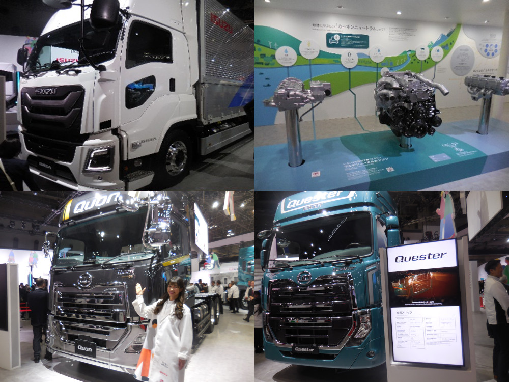 - 10年ぶりにGIGAのエクステリアが変更された。ライト回りが一段と精悍になった印象である。エンジンは4HK1をベースに、ヘッドの載せ替えによって多様な燃料に対応できるコンセプトが発表された。また、自動運転のEVバスやEV塵芥車など、環境問題や物流問題への真剣な取り組みが感じられる。さらに、グループであるUDトラックスのクオンおよびクエスター(EURO6)の展示もあり、トラクタ好きにはたまらない内容である。(吉冨)