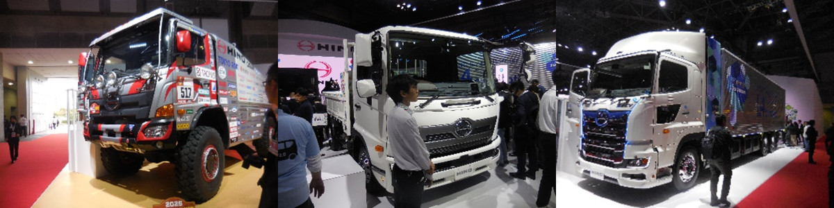 - 日野の耐久性を鍛えてきた象徴であるパリダカールラリー参戦車と市販車の日野レンジャーを見比べるのも面白い展示である。新しくなったFCV車もあり。(吉冨)