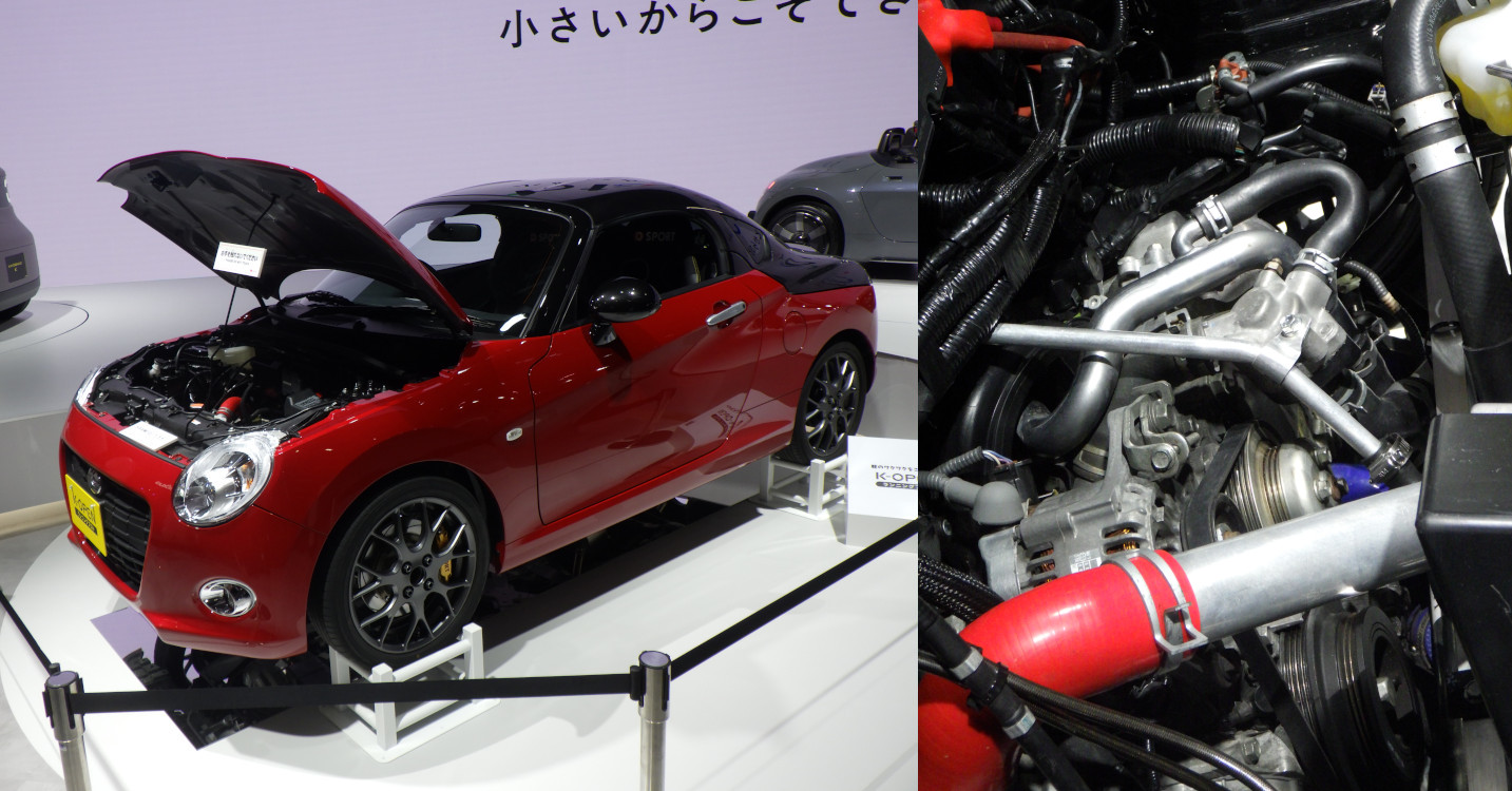 - 見た目は普通のコペンだがFR化。展示車はランニングプロトで実際に各種走行試験を行っているもの。(写真・左)縦置きエンジンが低い位置に配置され、ボンネットの上の方は大きく空いている。(写真・右)後輪のデフは軽トラックのものを利用しているとのこと。安く軽くしたいのが理由という。(鈴木)