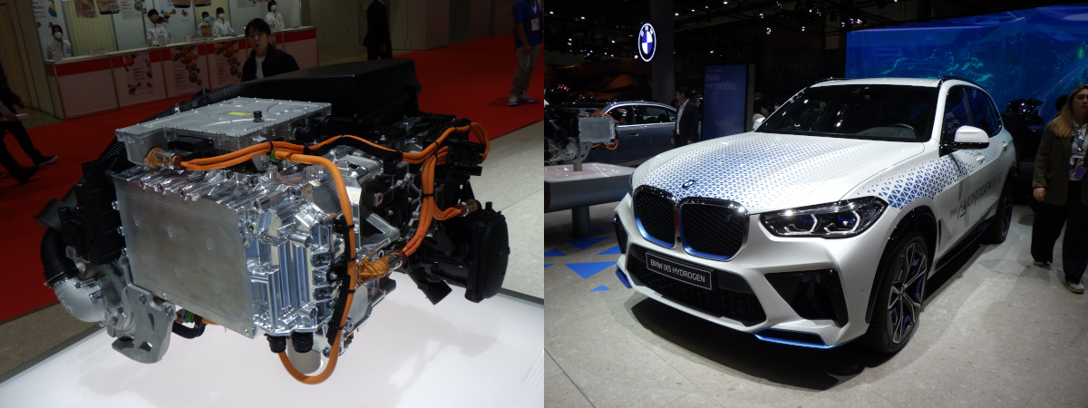 - トヨタと協業している第3世代のコンセプトモデルで、インバーターなどを統合化することで25%小型化したという。(写真・左)隣に展示されているFCシステムを搭載したX5(写真・右)では、ひとつ前の第2世代のシステムを搭載し、日本も含めて走行試験を行ってデータを取得している。市場投入は第3世代のものを搭載したX5になる予定で2028年とのこと。(鈴木)