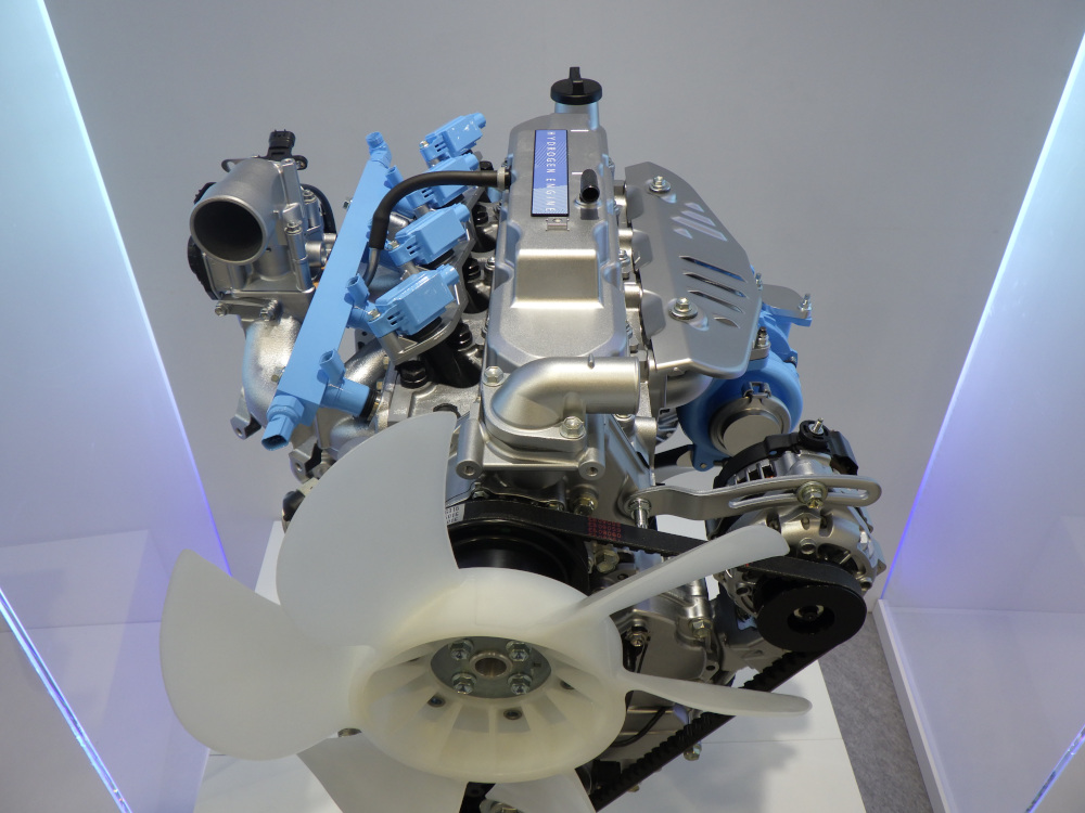 - 水素エンジンを展示。トヨタ自動車が開発している自動車用途は別に汎用機械や建機への搭載を企図したもの。ポート噴射で過給リーンバーンを採用。均質リーン燃焼でNOxを抑止し、シンプルな後処理装置で規制が適合できるレベルを目指す。市場投入は2030年代か。(鈴木)