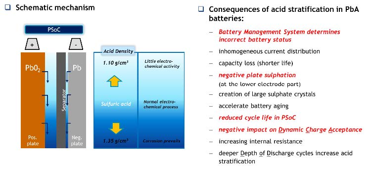 電動車両用ではないが,ICEVの省エネ対策の一つであるアイドルストップ機能の普及によって,鉛酸電池にも従来の電池とは異なる要求があり,これに対応するためにセパレータの工夫で対応し,良い結果が得られていることがMiyake(6-3)らから紹介された.従来の鉛電池はエンジン始動時の放電以降は常に充電状態にあり,やや過充電気味の状態で使用されてきた.そのため緩いガッシングによって電解液が循環し電解液の濃度が電解槽内で均一になっていた.これに対しアイドルストップシステム車(ISS)では図6-18に示す様に,頻繁なエンジン停止と再始動によって電池のSOCが低位にある状態となったため,ガッシングの機会がなくなり,電解液濃度の層状化(上部で濃度が低く,底部では濃くなる;図6-19参照)などによって電池性能の劣化・寿命の低下などの問題が発生し各種の対策が必要となっている.