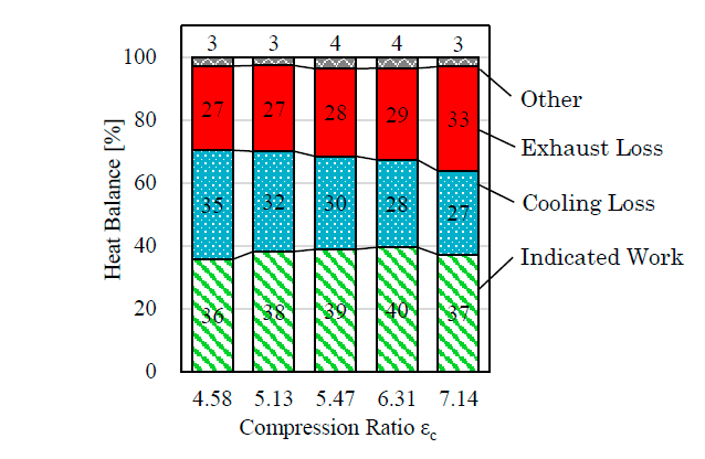 本研究(4-1)は,再生可能エネルギーを利用した水素製造過程で生成される水素と酸素の双方を有効利用しうるエンジンとして,アルゴンクローズドサイクル水素エンジン(図4-1)に関する一連の実験研究(第1~3報)の第2報である.作動ガス中のAr比率を高めると,圧縮端温度の上昇によりノッキングが問題となる.これを回避するために本報では,可変動弁系を用いて実圧縮比のみを下げて高膨張比サイクルとする検討を行った.その結果,燃焼室容積および発熱ガス量一定,作動ガス中Ar比率100%で,吸気弁閉じ時期により実圧縮比を7.1から4.6まで低下させると,吸気ガス量の減少に伴う爆発度の上昇と燃焼速度上昇にともない等容度が向上し,図示効率はやや低い圧縮比(6.3~5.1)において高くなることなどを明らかにした(図4-2).(河崎)