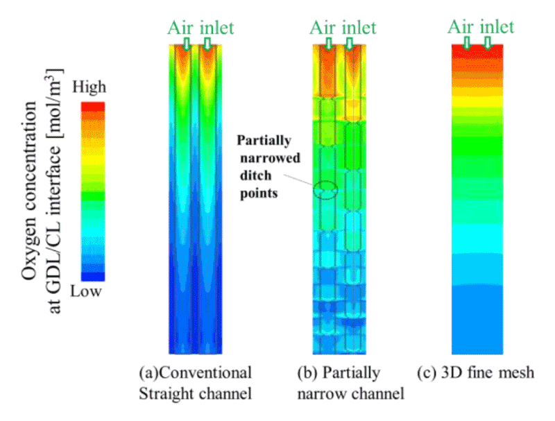 林ら(2)は、FC流路の挙動を2相流と電気化学反応を組み込んだ発電シミュレーションで明らかにする手法で、流路の最適設計を行った。一般的なストレート型の流路では流路や電極内に生成水が滞留することで酸素拡散が阻害されるため、前モデルでは三次元的な微細格子流路を採用し、排水性の向上を図っていたが、構造上から圧力損や部品点数の多さなどが問題となっていた。そこでストレートな流路に図3のような絞りを設けた際の電極内の強制対流による効果をシミュレーションで求め、図4に示すように、単純なストレート流路でも絞りによって微細格子型と同等の効果が得られることを見いだした。これを基に、この流路構造の最適化までを同シミュレーションで行うことで試作品を極力減らした開発を可能とした。