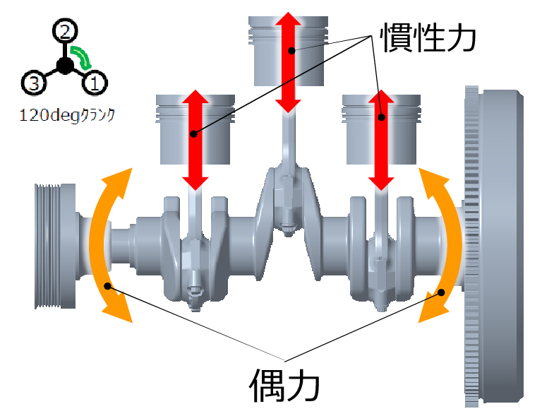 振動対策レスシリンダ化による燃費低減という恩恵は受けるものの、本エンジンの懸案の一つは3気筒エンジンによる偶力である。3気筒エンジンは図6に示すように主運動系が非対称配置となることでクランクシャフト両端を上下方向に揺さぶる力(偶力)が発生する。バランスシャフトで相殺することで解決は可能であるが、燃費低減効果が目減りしてしまう。本エンジンでは図7に示すようなバランスマスをクランクプーリ、フライホイールに持たせることで上下方向の偶力を水平方向へ変換し、車両開発部門とエンジンマウントの最適化を行うことでエンジン全体としての加速度レベルを現行同等以下とすることができた。