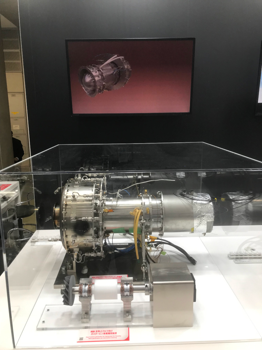 - 空飛ぶクルマの運行時間拡大のためのガスタービン(GT)エンジン用のベアリング。このGTは40 kW程度とのこと。高速回転のため、軸受への給油が難しく、独自の構造で有効に給油をしている。(飯島)