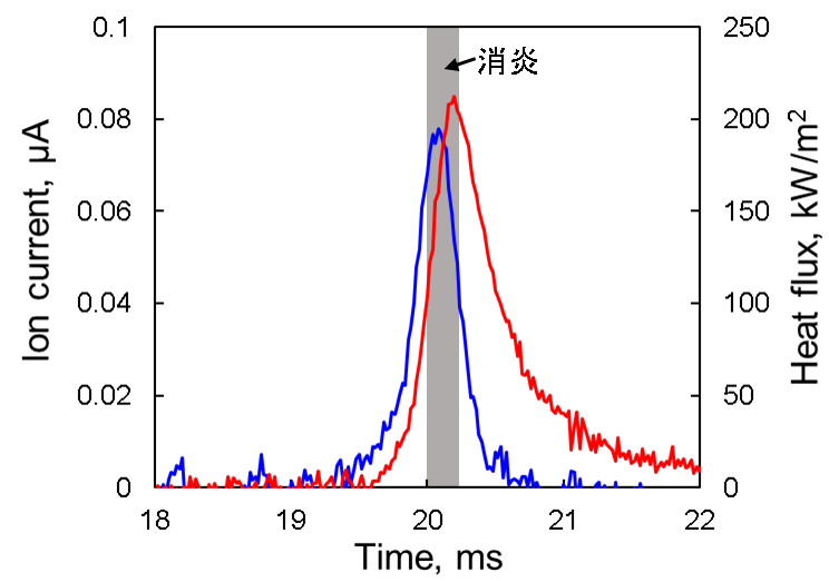 次に、火炎-壁面間距離とイオン電流および熱流束の関係をまとめたものを図4に示す。ハイスピードカメラによる撮影画像をもとに判断すると、今回の測定条件では火炎-壁面間距離が500 µm程度になるとイオン電流および熱流束が上昇を始める結果となった。その後、火炎は壁面まで280 µm程度まで接近し、それに伴いイオン電流および熱流束も増加している。この様に火炎接近から消炎に至るまでのイオン電流と熱流束の時系列変化を同時に取得することができ、火炎の接近によりイオン電流と熱流束が変化することから、検証段階ではあるが、壁面近傍での火炎の挙動を可視化なしで推定し、火炎の挙動と熱流束の関係を調べることが出来る可能性が示された。