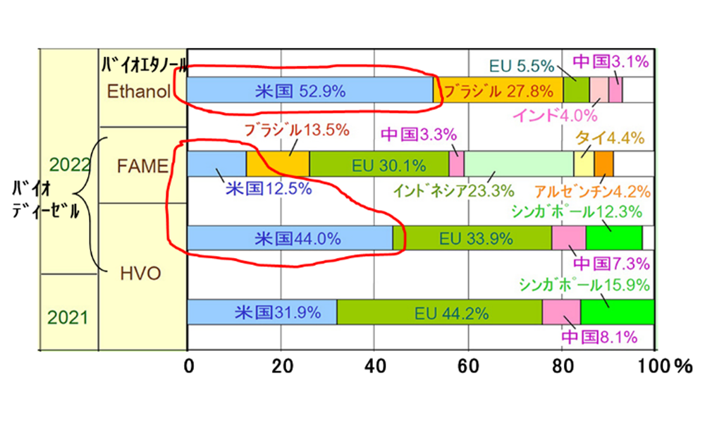 バイオ燃料について、米国は20年以上前からクルマ用として化石燃料に混合したE10やB5燃料などを政治的に推進してきた。2023年9月のインドG20サミットでは、モディ首相が世界バイオ燃料同盟(Global Biofuels Alliance:GBA)を米国、イタリアも含めて主にグローバルサウスの国々と設立した。米国はバイオエタノール、バイオディーゼル共に世界一の生産国(図4)で、輸出も含めさらに増産する計画だ。なお、バイオ燃料は、輸入し使用した国のCO2低減カウントとなる。