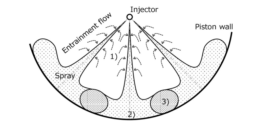 宮下ら(1)は「噴霧の干渉がディーゼル燃焼に及ぼす影響(第1報)」と題して講演を行った。筒内に噴射されたディーゼル燃料噴霧は周囲空気を取り込みながら発達し、やがて着火に至り噴霧火炎を形成する。その過程においては、図1に示すように1. 噴霧火炎面側へ向かう空気導入の流れが隣接する噴霧火炎のそれと衝突する(エントレインの干渉)、2. 噴霧火炎はピストン壁と衝突し壁面に沿って発達後(壁面の干渉)、3. 同様に発達した隣接する噴霧火炎とも干渉する(隣接噴霧火炎間の干渉)。
