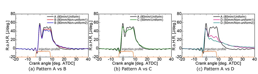 図5(C)の熱発生率は図4のパターンAとDの比較であり、エントレイン、壁面に加えて隣接噴霧火炎間の干渉影響が含まれる。隣接噴霧火炎との干渉が追加されることで拡散燃焼初期のクランク角3度ATDC付近からの熱発生率が大幅に低下している。パターンCで見られた噴射期間中の熱発生率の増加も見られず単調に減少し、噴射終了後のクランク角10度ATDC以降においても熱発生が続いている。隣接噴霧火炎との干渉によって燃焼が緩慢になり、燃焼期間が長期化していることが分かる。図6の可視化画像からも輝炎が観察され始めるクランク角度2度ATDC付近から隣接火炎との干渉が発生している様子が観察されている。隣接噴霧と干渉した輝炎はその場に滞留し続けており、噴霧の拡散が抑制されていると推察される。