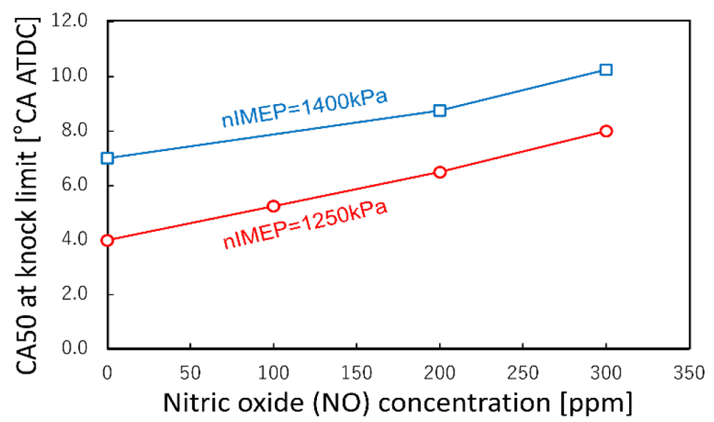 辻ら(1)は排気再循環経路内燃料改質(REGR)の火花ノック抑制効果を明らかにし、その要因の解明を行った。図1に実験装置を示す。EGR経路に改質触媒を設け、燃料インジェクタから改質燃料を供給することで、水素やCOを発生させ還流させている。改質触媒のS/C比(Steam-carbon ratio)を2〜∞の範囲で変化させ測定したノック限界CA50を図2に、ノック限界における図示熱効率を図3に示す。EGR条件(S/C=∞)と比較しREGRでは、ノック限界CA50を最大4.5°CAノック抑制効果が認められ、点火進角可能となり、熱効率で最大0.5ポイント向上している。さらに、REGR条件下では改質燃料添加量がごく少量でも触媒下流NO濃度が大幅減少することが確認された。一方、水素発生量とノック限界には明確な相関が見られていない。加えて、検証のため行ったNO添加実験(図4)では、吸気NO濃度の増加に比例してノック限界CA50が遅角し、NOがノックを顕著に助長することが示された。以上の結果より、REGRによるNO除去がノック抑制の主要因の一つであると報告があった。今後は水素の影響についても、さらなる解明が期待される。