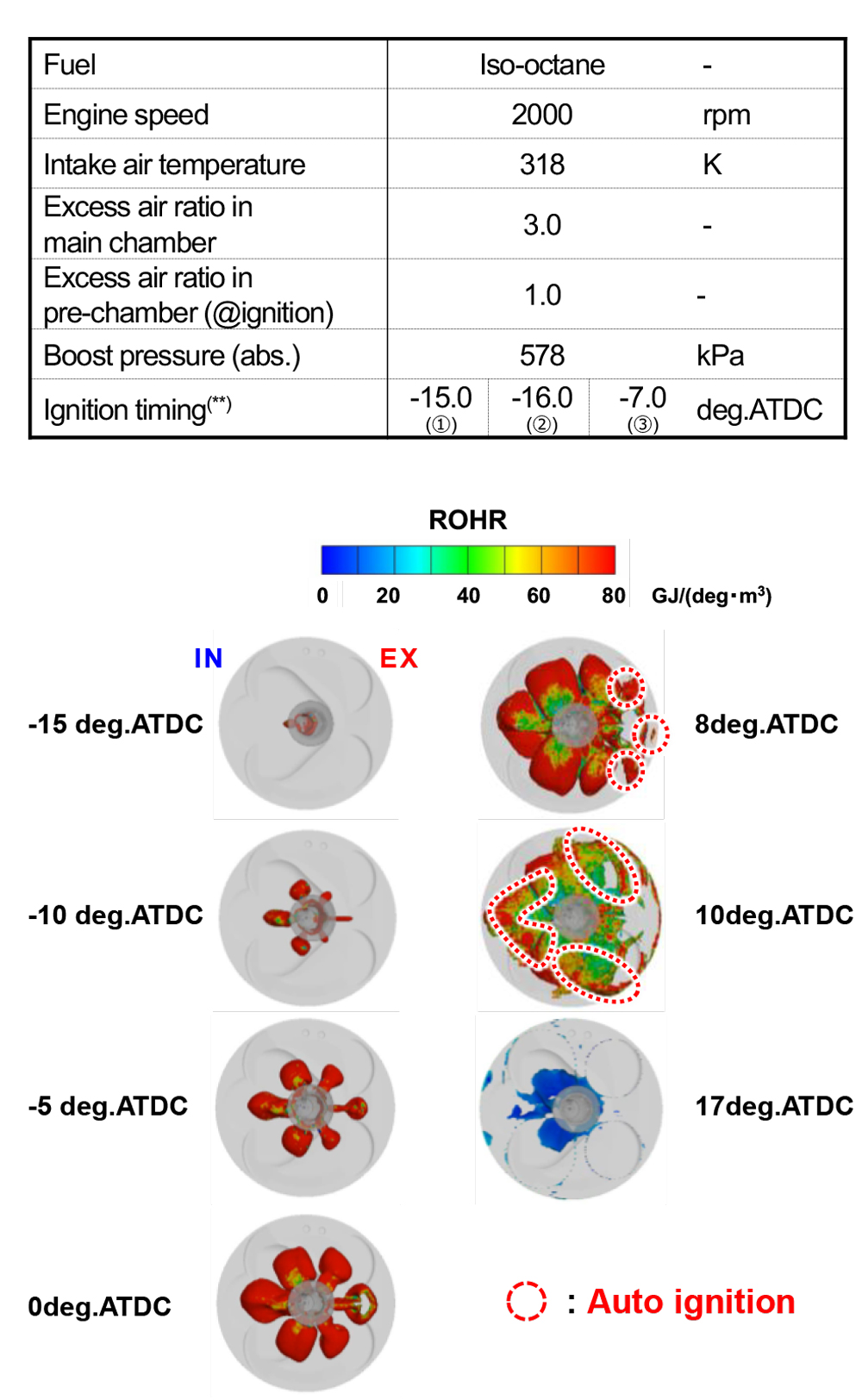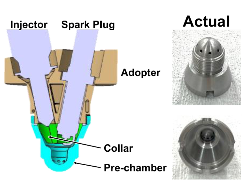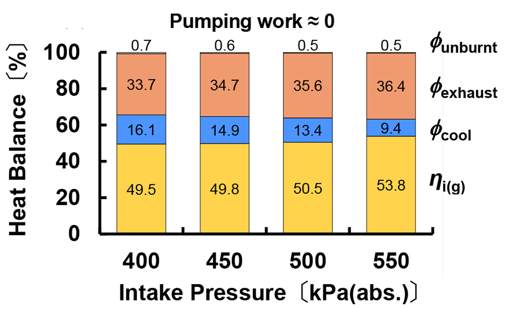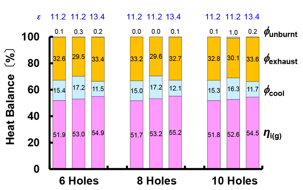 野村ら(2)は、上述(第1報)に引き続き、(第2報)として新燃焼方式(SERC燃焼)実現の可能性を三次元CFDでの数値計算と単気筒実機検証にて追究している。副室からの高温ジェットが壁面に到達する前に、未燃混合気が連鎖的自着火で燃焼することで、ノッキングを伴わずHCCIに近い迅速な燃焼が実現されたとみなしている。図2に本研究で用いた計算条件でのヒートバランスを示す。最大図示熱効率は8噴孔で55.2%、冷却損失も10%前半を記録している。SERC燃焼は高い図示熱効率と冷却損失低減に寄与する可能性が示唆されたと報告があった。また、実機検証では、量産エンジンの単気筒のみを使用し、副室仕様に改造した。その副室(図3)は、CFD結果から8噴孔を採用している。図4に各運転点のヒートバランスを示す。実機検証でも、過給圧550kPaで、IMEP(g)=2343kPa、グロス図示熱効率53.8%、冷却損失9.4%、未燃損失1%未満、NOx排出0.2g/kWh未満を実現したと報告があった。興味深い新燃焼方式SERC燃焼の今後の進展に期待したい。