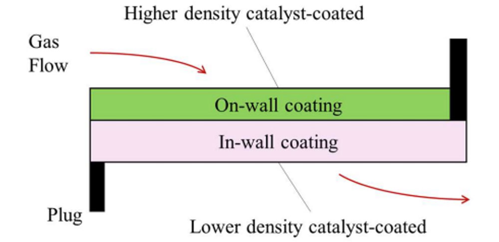 滝沢ら(1)は、初期PN捕集効率、圧力損失、および三元触媒機能を高い次元で成立させた触媒担持型ガソリン用パティキュレートフィルタ(4way-GPF)を開発した(図1)。彼らは圧力損失の悪化に寄与する隔壁表面捕集層(on-wall)の触媒密度を高くし、隔壁内部(In-wall)の触媒密度を低くすることで、浄化機能に必要な触媒コーティング量を確保しつつ、コーティング触媒によるガス流路の閉塞を抑制できると考えた。開発品は従来品に比べて低い圧力損失で初期PN捕集効率の開発目標を満たしつつ、三元浄化特性の低温活性を改善したとしている。