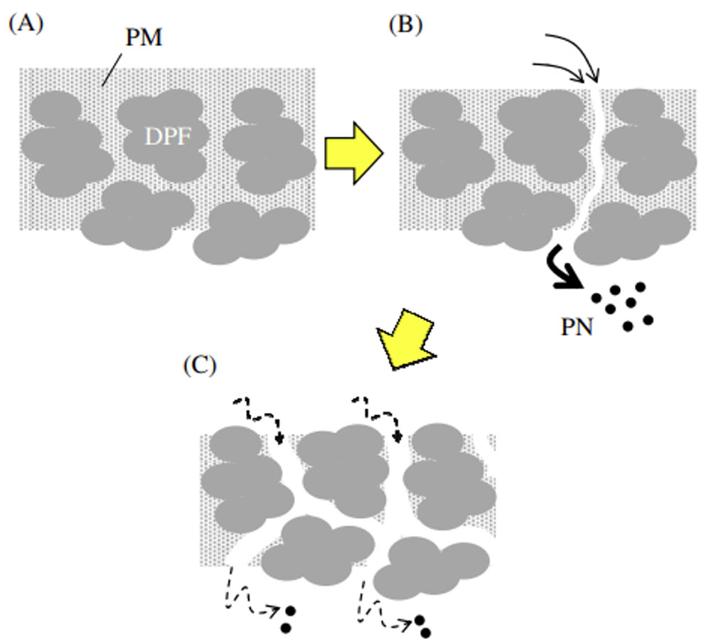 阿野田ら(2)はディーゼル機関のEuro7対応後処理システム((図2左))のPN10排出挙動について詳細に調査した。尿素水を噴射する位置と温度によって尿素水由来のPN10が大きく変化し、近接(close-coupled, cc)SCR上流位置で尿素水を噴射した場合はPN10がほとんど排出せず、床下(under-floor, uf)SCR上流位置で尿素水を噴射した場合にPN10が顕著に増加した。DPF強制再生やDPF連続再生が起こる高負荷時のPM燃焼過程でのPN10排出量を調査したところ、高排ガス流量条件においてPN10排出量が増加した。この具体的なメカニズムは未解明だが、PM燃焼が部分的に進んだ状態(図3の(B))で一時的に局所流速が上昇することでPN10排出ピークを示すという仮説を立てた。この仮説の検証を期待したい。
