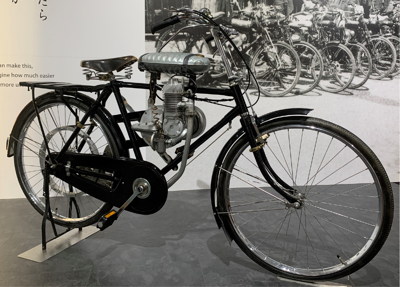 戦後、本田宗一郎は妻が苦労して自転車で遠くまで買い出しに行く姿を見て、旧陸軍が使っていた、無線機用の発電エンジンを自転車用補助エンジンにすることを考えつく。これを発売すると評判が良く、発電エンジンの在庫がすぐに無くなり、ホンダ初の試作エンジン(図1、図2)を造り始めた、燃料タンクは湯たんぽ(図3)を活用している。“これができたらどんなに楽か どれほど役に立つか”との思いがこもっている。そして1947年11月に初のホンダオリジナル市販製品となる自転車用補助エンジンA型(2ストローク50cc)を生産開始している。