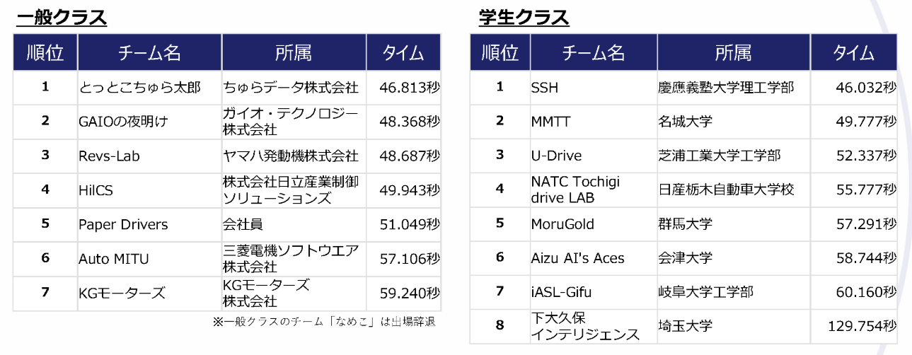 各チームが自作のアルゴリズムを搭載した自動運転EVカートで最速ラップを競いました。制限時間20分の中、雨天によるウェットコンディションという厳しい環境下でも、各チームは高い技術力と対応力を発揮し、熱戦を繰り広げました。
